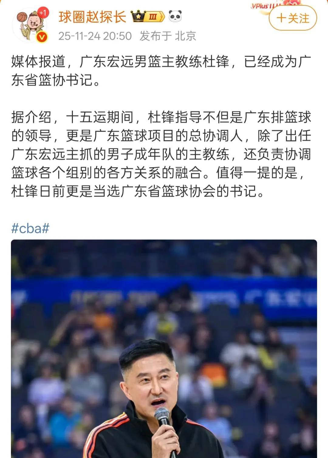 球迷的这种揣测其实大有道理。众所周知,杜锋近年来深扎广东篮球,作为广东宏远主帅,他带队拿下了三连冠,树立了不可撼动的地位。尽管杜锋的身份主要体现在“宏远主教练”,但实际上他始终心怀更大的抱负。特别是近几年,杜锋频繁出席社会活动,担任了例如二沙岛篮排中心书记、广东省篮协副主席等多个身份,虽然这些职位不归体育体制内,却体现出他希望通过体育管理层面拓宽职业道路。这几年广东队屡屡无缘冠军乃至总决赛,部分原因也与杜锋精力分散有关——休赛期常参加各类活动导致训练时间不足,影响了球队整体竞技状态。